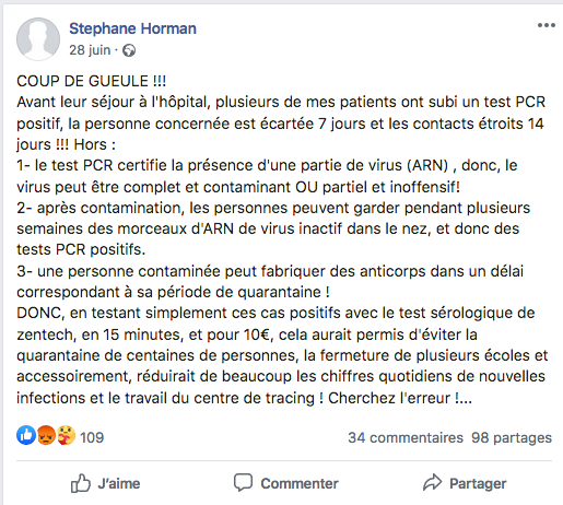 Le 29 juin, on pouvait lire son exaspération au sujet des tests PCR, auxquels il aurait préféré des tests sérologiques pour éviter les quarantaines et les fermetures d’école.